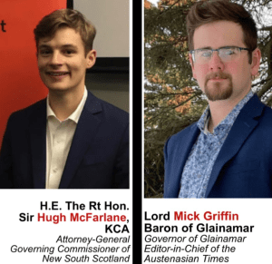 Earlier this month, Attorney General and Governing Commissioner of New South Scotland, H.E. The Rt. Hon. Sir Hugh McFarlane, KCA, formed the All Austenasia Party along with Lord Mick Griffin, Baron of Glainamar.