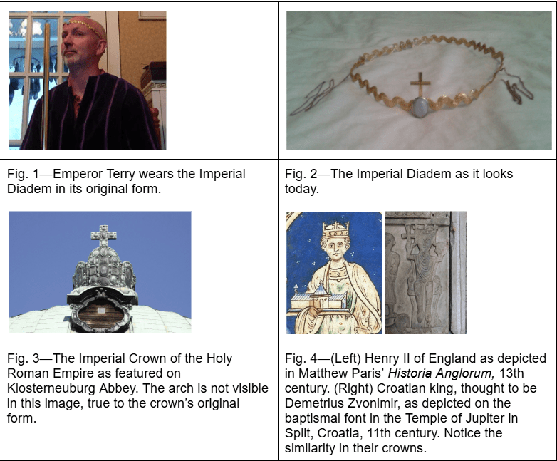 The Imperial Diadem made its debut in the spring of 2009, when it was constructed for the coronation of Emperor Terry. At this point, it consisted of a golden ribbon wired in a circlet and sporting an unspecified white stone, informing a front and centre of the crown. The stone is a family heirloom of the Austens, and indeed the comparatively modest symbols of imperial potency remain in the possession of the house (fig. 1).