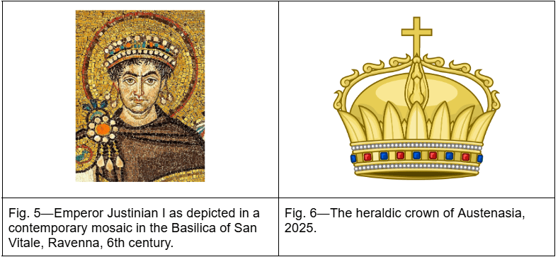 The base of the crown is borrowed from the diadem depicted on an iconic mosaic of Emperor Justinian I (fig. 5). Rays emanate from around the crown, in the fashion of an eastern crown—a memetic accessory broadly afforded to any conception of divinity, kingship, and virtue spanning several religions and empires, particularly in the near east. Instead of a cap of maintenance, a semi-orb traces the inside of the crown. An early form of the mitre may have inspired Byzantine jewellers to do something similar, as can be seen in the crown of Holy Roman Empress Constance of Aragon among other examples. In cases of closed crowns lined with fabric on the inside, low-down arches served more of an active role in its structural integrity. Tall arches, however, adorn the heraldic crown of Austenasia. Not for structural reasons anymore, but for the same aesthetic reasons that pleased Emperor Charles V and his later admirers—on which he would use what looks like golden curls, called flourishes, instead of pearls and stones. On the top is a plain latin cross (fig. 6).